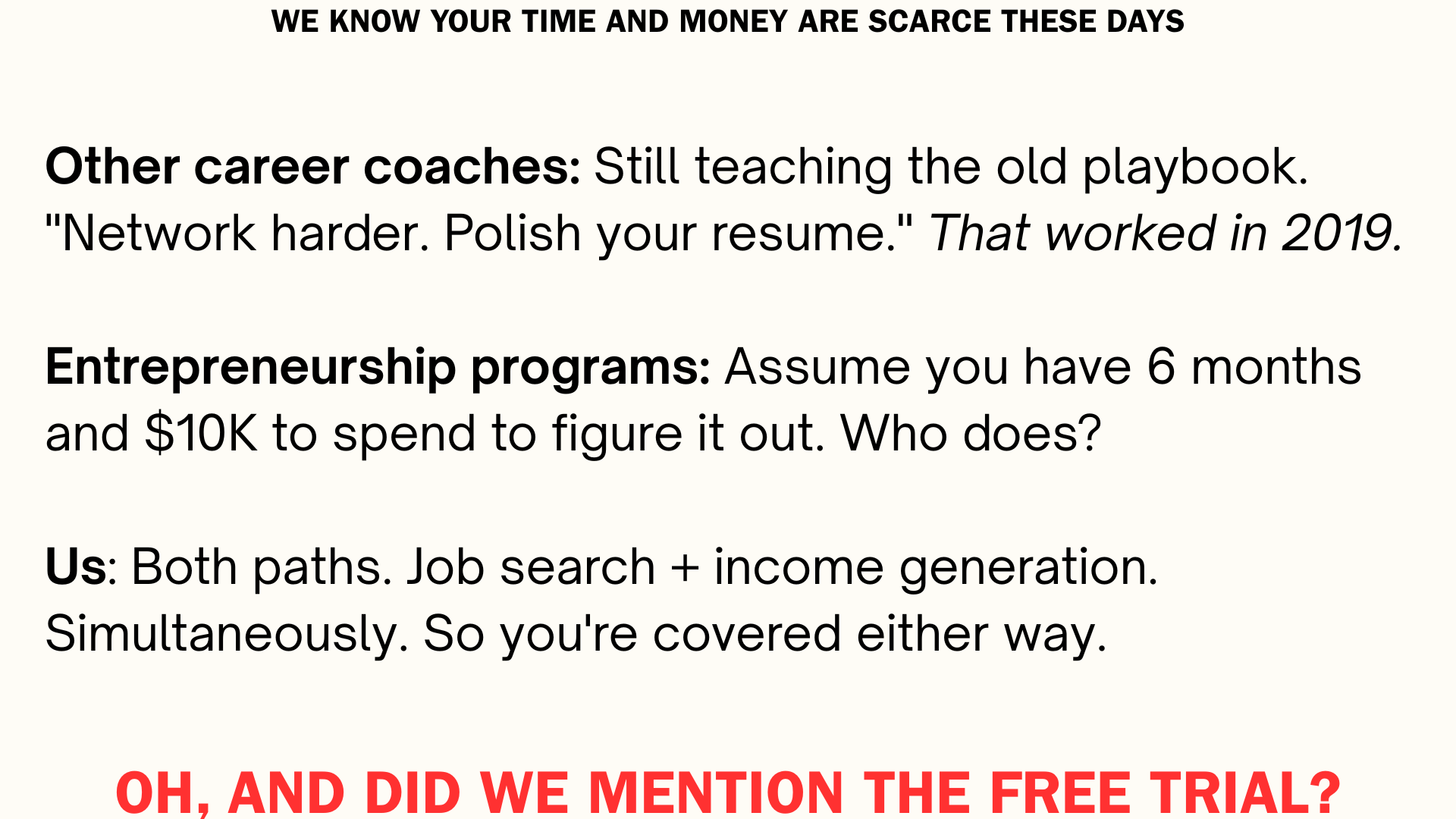 When the average job search is 12-18 months and people are watching their savings disappear, $4,500 is a barrier most can't cross. The people who need help most can't afford it.